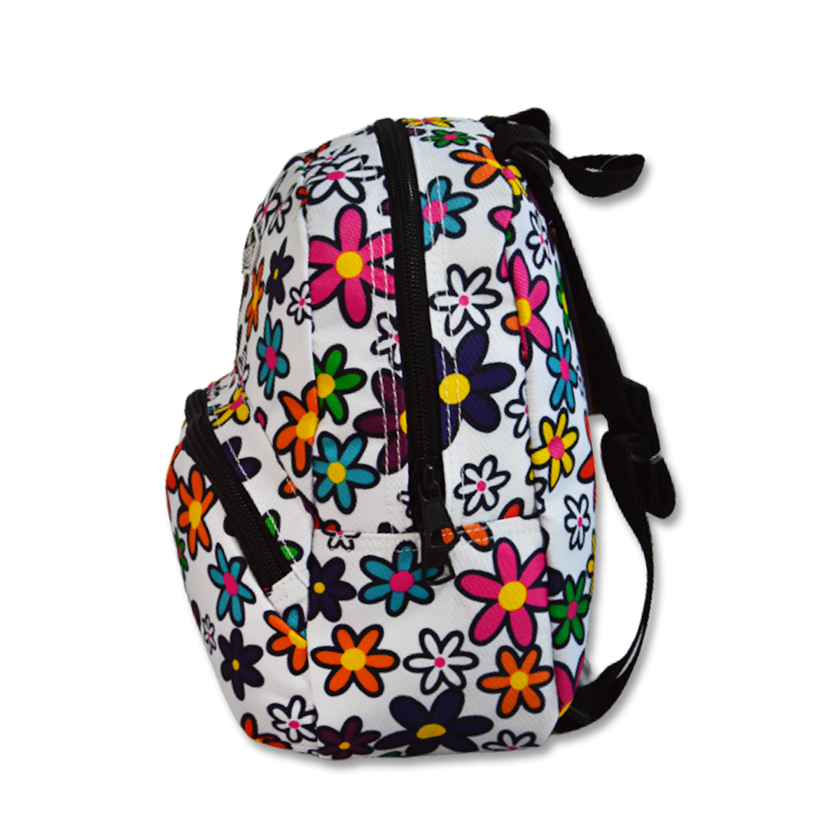 Plecaczek szkolny w kolorze białym z wielokolorowym nadrukiem w kwiaty.