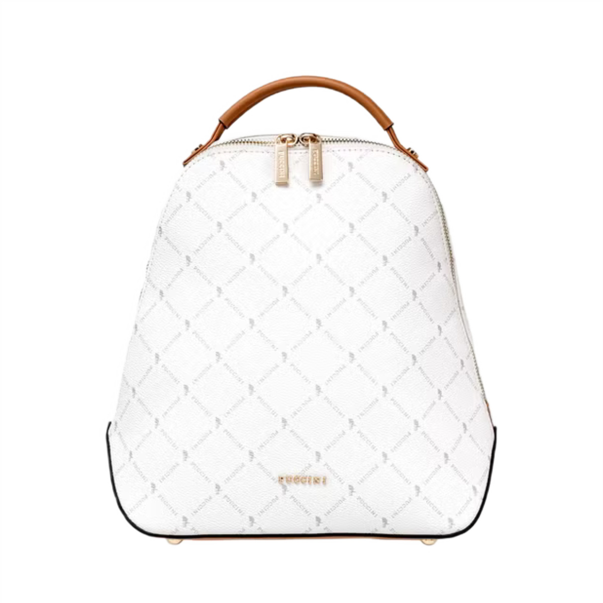 Plecak w biało-beżowej kolorystyce z logotypami marki Puccini oraz złotymi okuciami.
